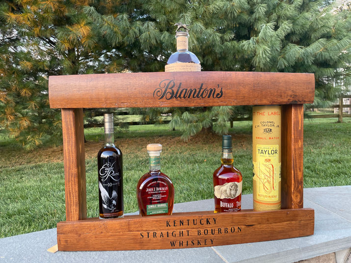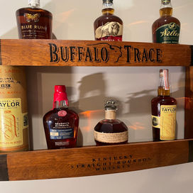 Our whiskey barrels arrive whole just a few weeks after dumping their wonderful cargo. The staves and barrel heads then undergo months of drying, sanding, staining and sealing to be worthy of hanging on your wall. Our shelves will each comfortably hold 12-16 bottles. The staves are 30" wide with about 25" of interior shelf space on each level - total height is around 19". The lower level will easily fit taller bottles (EH Taylor & Eagle Rare).